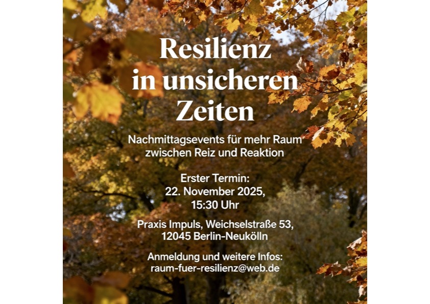 Durch gemeinsames Teilen, achtsame Körper- und Wahrnehmungsübungen, Hintergrundwissen und integrative Verkörperung schaffen wir Raum für Veränderung. Wir bereiten den Boden dafür, alte innere Verknüpfungen zu lösen und mit mehr Gelassenheit, Selbstbestimmung und Freude durch das Leben zu gehen. Am 22.11.2025 widmen wir uns dem spannenden Thema Grenzen & Verbindung. Was bedeutet dir dein Raum? Was begegnet dir im Kontakt? Neugierig erforschen wir das Thema und das was uns im Kontakt begegnet.